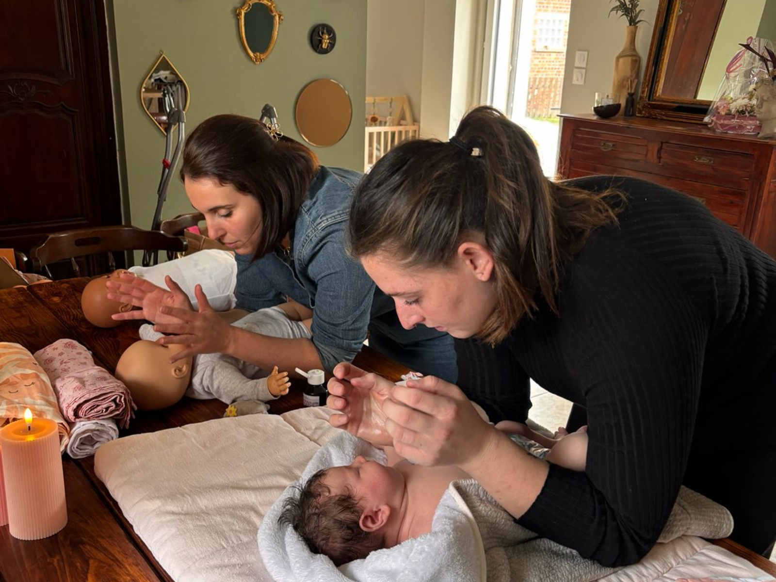 - un temps de massage ou je vous montre les gestes sur un poupon pendant que vous massez votre bébé à votre rythme